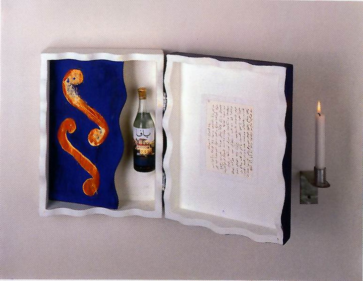 L’installation comporte 30 boîtes en bois. Pour chacune des boîtes présentées, un citoyen expatrié de Jaffa m’a confié, à travers un texte, une part de son vécu, de son intimité, ou même son testament. Chaque boîte contient également de l’eau de Jaffa et des épluchures de mandarine posées sur un fond de bleu indigo, teinture qui fut la spécialité de la ville. Ces boîtes sont exposées en rangées. A côté de chaque boîte se trouve une bougie allumée et au-dessous de celle-ci se trouve un récipient qui contient de l’eau teintée au pigment d’indigo, reflétant ainsi la flamme vacillante de la bougie.